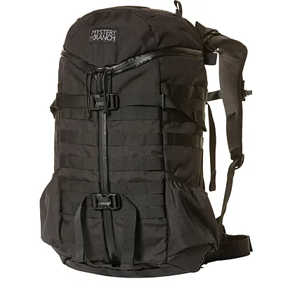 Lots of MOLLE options to add stuff to the outside. Comfortable yolk-style harness. Reinforced webbing and stitching throughout. Water repellent. Hydration pouch.